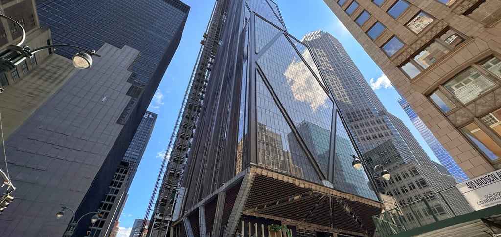 Estructura de "Abanico": El diseño estructural es único. Una innovadora estructura de acero en forma de abanico en la base eleva el edificio 24 metros sobre el nivel de la calle, creando una plaza pública abierta y luminosa que conecta Park Avenue y Madison Avenue. Este gesto de diseño no solo mejora el espacio público, sino que también permite una mayor entrada de luz natural a nivel de calle.